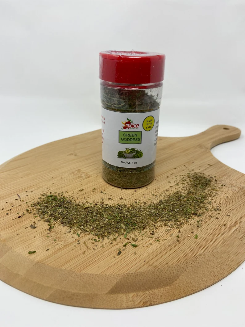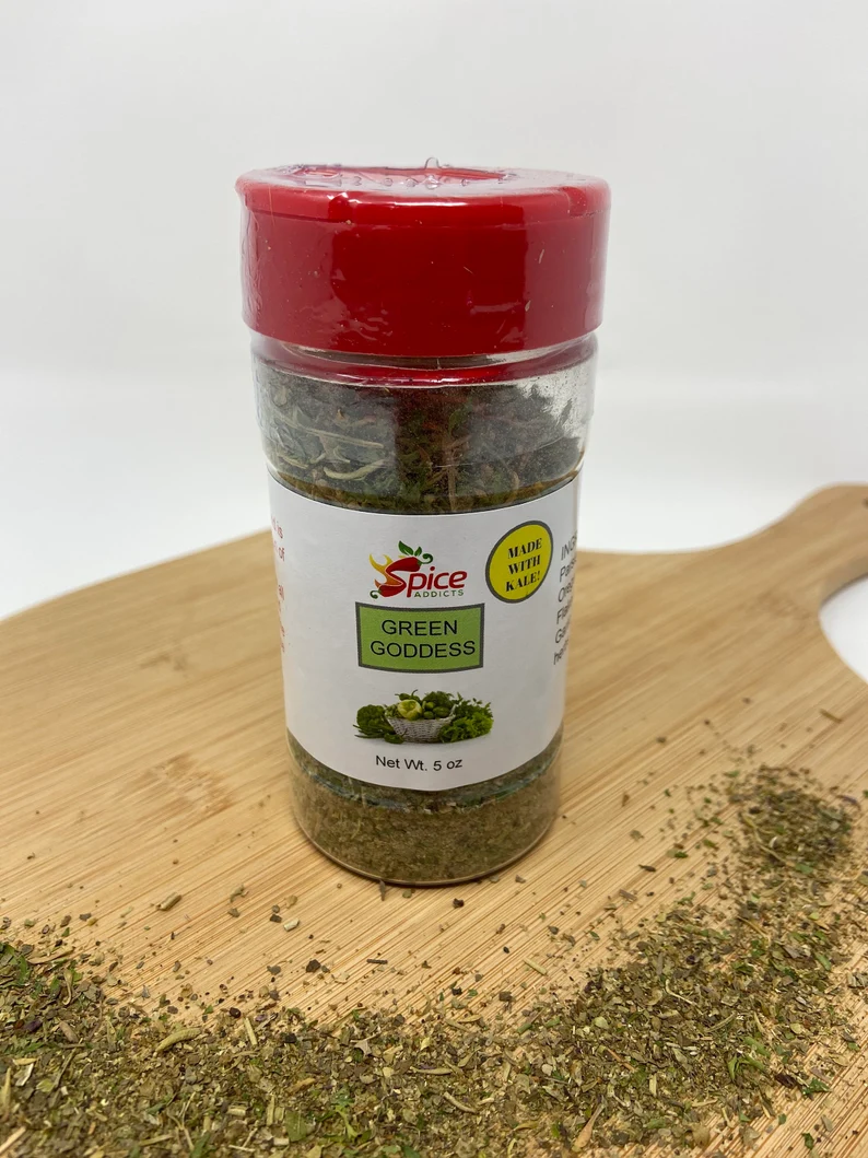 Spice Addicts Green Goddess is an herb blend with all of your favorite greens including kale flakes, parsley, oregano, and thyme. This seasoning is perfect for grilling, baking, sautés, and more. This is our most ordered seasoning hands down by both consumers and commercial kitchens alike. Get yours while supplies last.